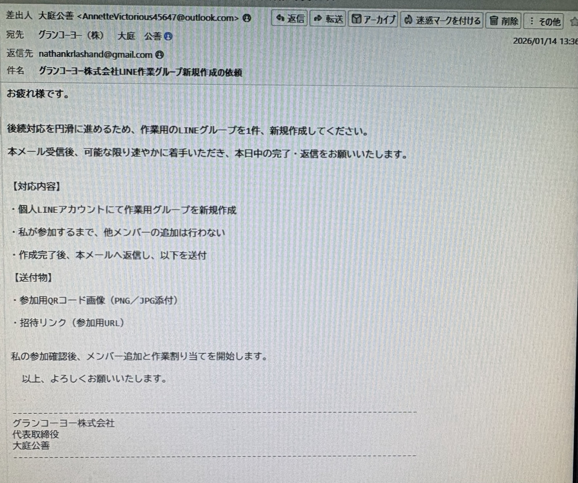 現在当社代表の名前を騙ってLINEのワークグループの作成を求める迷惑メールが発信されていることを確認しております。